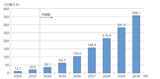 特に生成AI市場は急成長しており、2023年の205億ドルから、2024年には361億ドル(AI市場全体の19.6%)、2030年には3,561億ドル(同43.1%)に達すると予測されています。